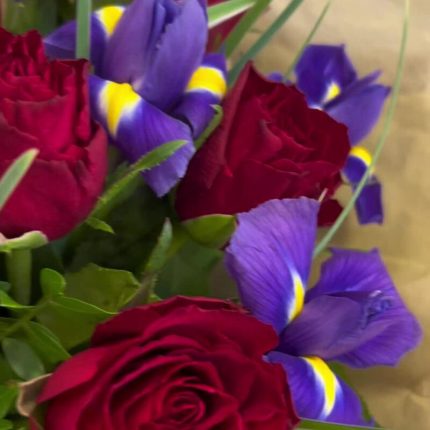 Букет из лилии, хлопка, эустомы, роз, диантусов, ирисов, кустовой хризантемы и самшита в стильной упаковке “Джун Осборн”