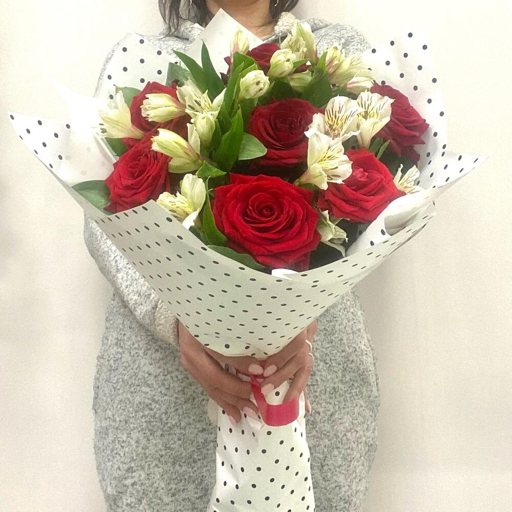 розы эквадор (60 см) – 7 шт.Альстромерия – 4 шт.Рускус сочи – 11 шт.Упаковка дизайнерская – 1 шт.Лента – 1 шт.