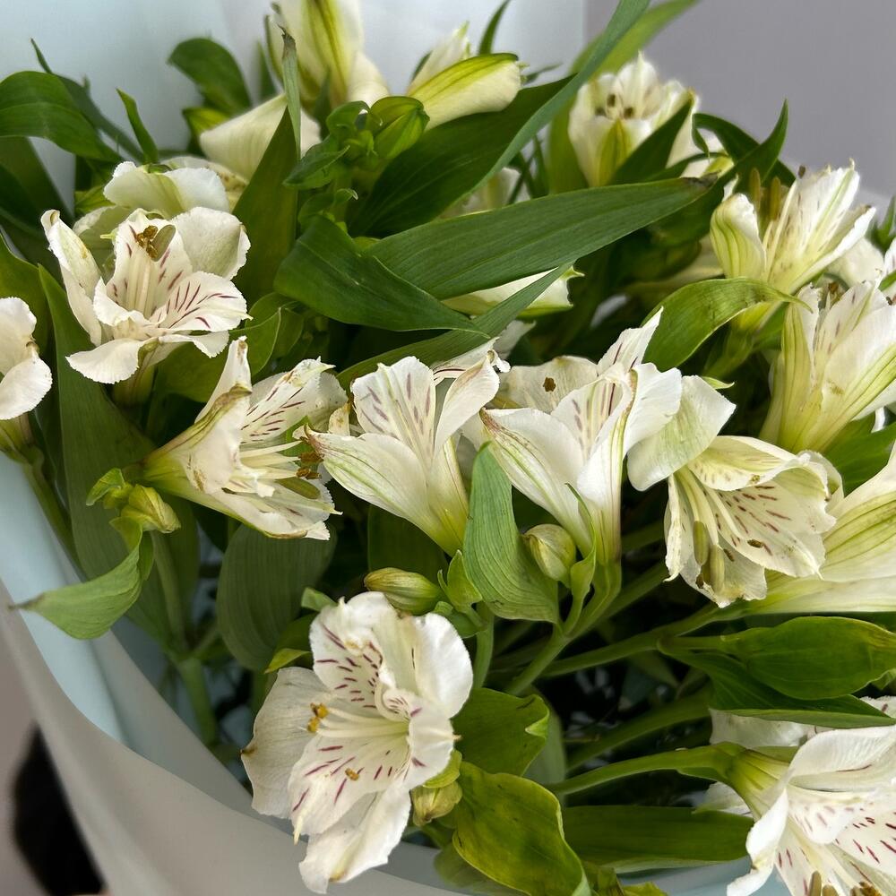Альстромерия – 9 шт.Упаковка дизайнерская – 2 шт.Лента атласная – 1 шт.Зелень – 2 шт.