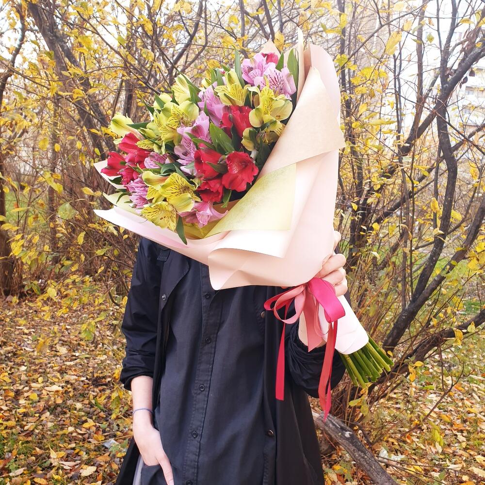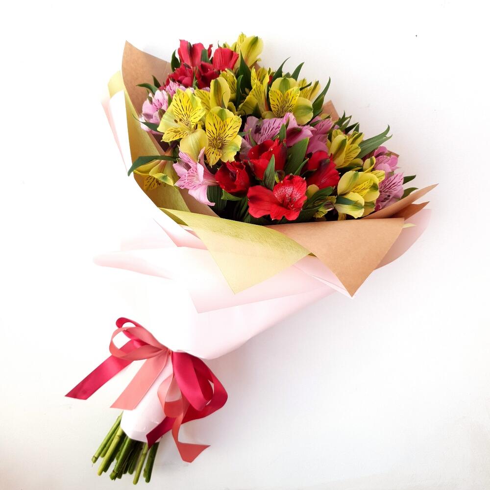 Лента атласная – 2 шт.Упаковка дизайнерская – 3 шт.Открыточка с вашими пожеланиями – 1 шт.Альстромерия Микс Европа – 9 шт.любовь флориста (бесплатно) – 1 шт.