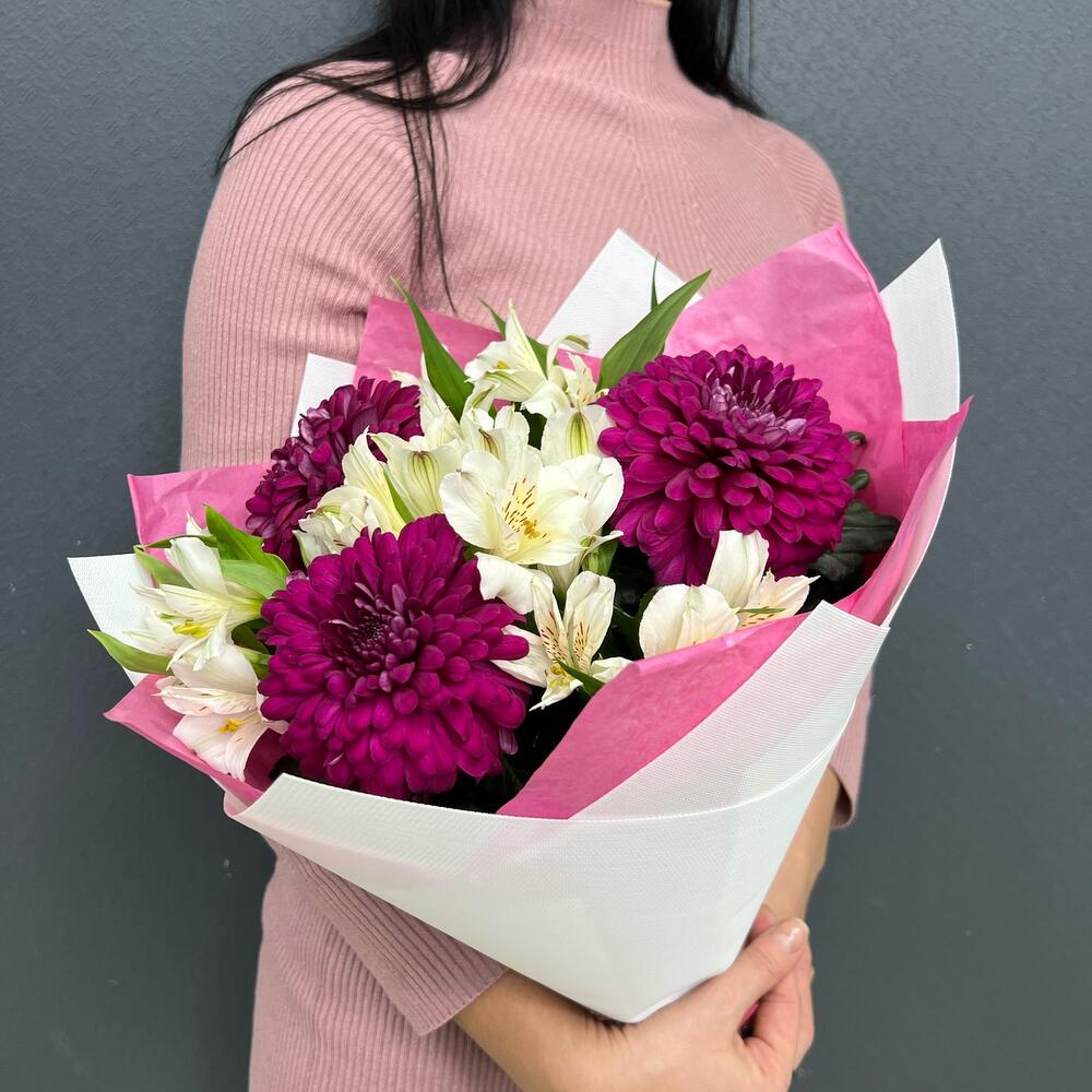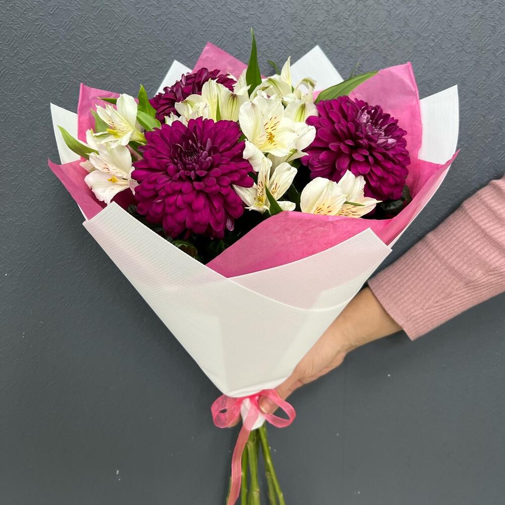ламира – 3 шт.Альстромерия – 4 шт.Тишью – 2 шт.Пленка матовая – 2 шт.Лента атласная – 2 шт.