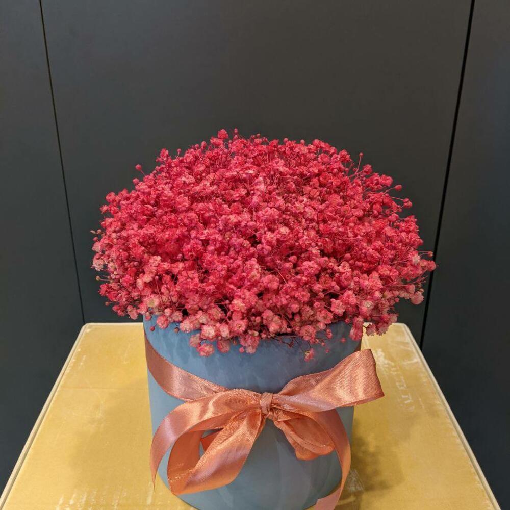 “Сиреневый туман” – композиция из гипсофилы в шляпной коробке