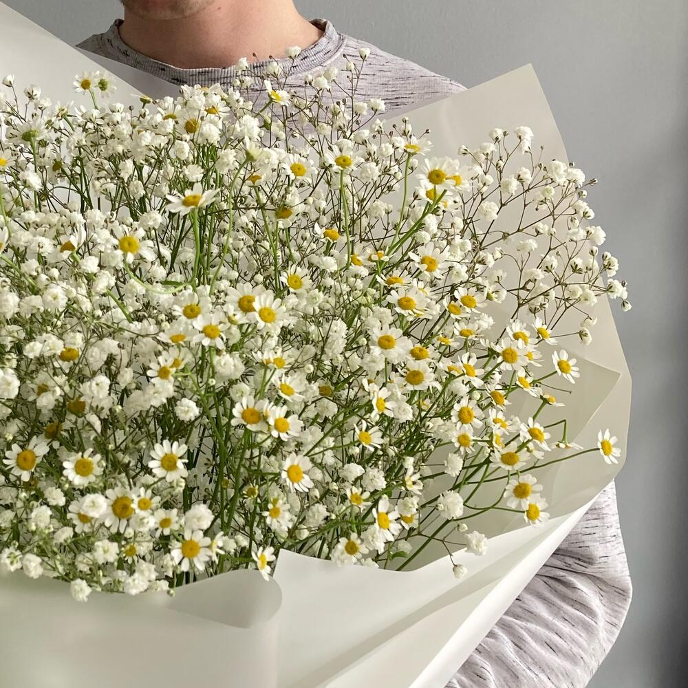 Гипсофила – 5 шт.Упаковка дизайнерская – 1 шт.Матрикария (ромашка) – 7 шт.