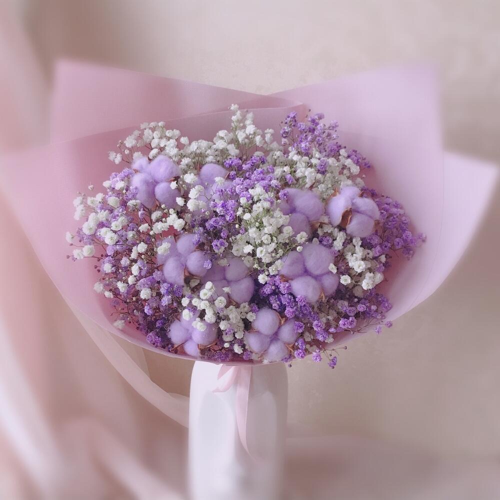Хлопок – 9 шт.Лента атласная – 1 шт.Упаковка дизайнерская – 1 шт.гипсофила фиолетовая и белая – 5 шт.
