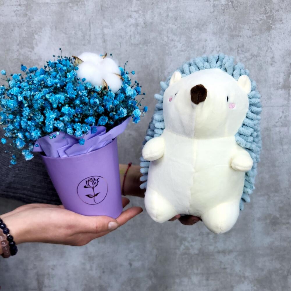 Гипсофила – 5 шт.Хлопок – 1 шт.Стакан – 1 шт.маленькая игрушка ежик – 1 шт.