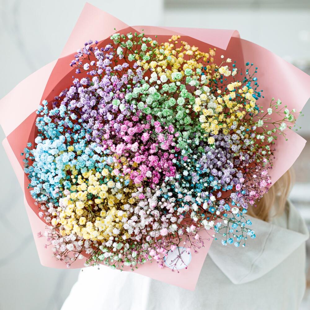 Шикарный букет из воздушной гипсофилы. Ни одна дама, точно не останется равнодушной при виде такой радуги .Инструкция по уходу за цветами прикреплена к каждому заказу.Цветы гипсофилы отличаются стойкостью и даже при высыхании не теряют, декоративности и цвета. Что позволяет, долгое время украшать интерьер в качестве сухоцветов.Подпишем открытку с вашими пожеланиями бесплатно
