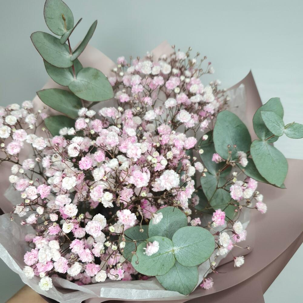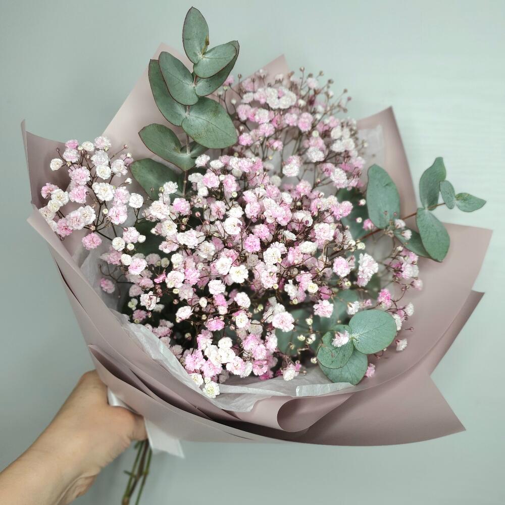Гипсофила – 2 шт.Эвкалипт – 3 шт.Упаковка дизайнерская – 2 шт.