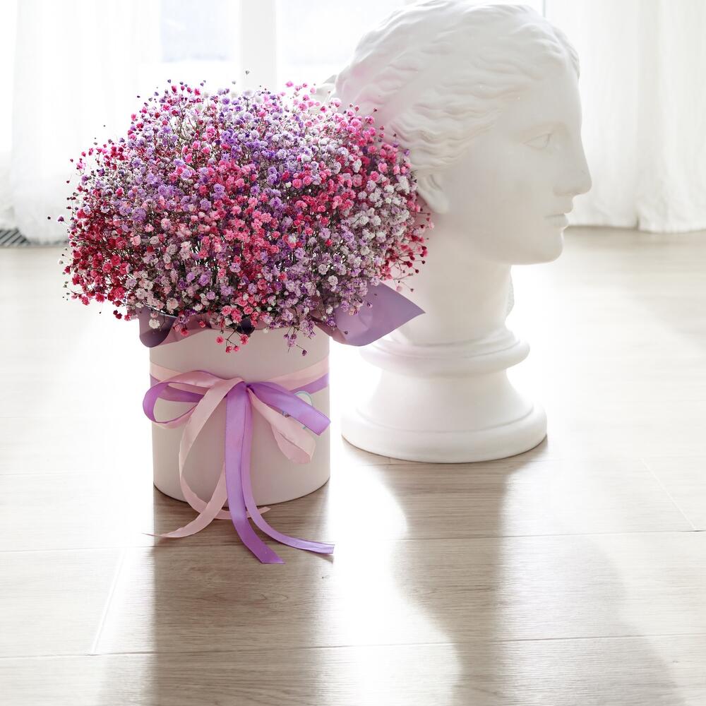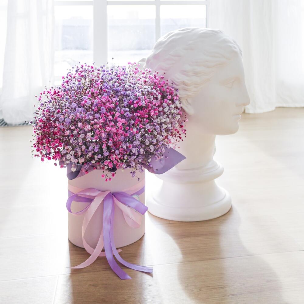 Очаровательная, воздушная композиция из гипсофилы, в шляпной коробке.Цветы стоят в специальной флористической губке,что позволяет им больше оставаться свежими и радовать получателя. Так же композиция в коробке это очень удобно и эффектно, так как не надо ставить букет в вазу и менять воду. Необходимо лишь подливать в губку воду.Инструкция по уходу за цветами прикреплена к каждому заказу.Цветы гипсофилы отличаются стойкостью и даже при высыхании не теряют, декоративности и цвета. Что позволяет, долгое время украшать интерьер в качестве сухоцветов.Подпишем открытку с вашими пожеланиями бесплатно
