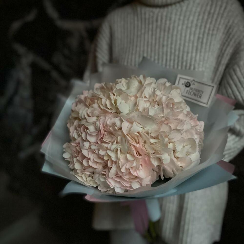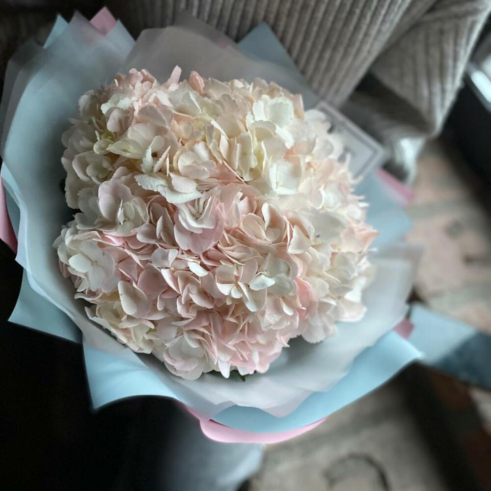 Красивый букет из 3 розовых гортензий в упаковке “Анже”