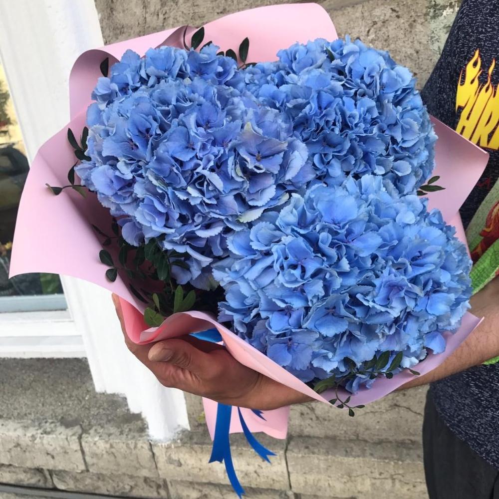 Гортензия синяя – 3 шт.Упаковка – 1 шт.Лента атласная – 1 шт.