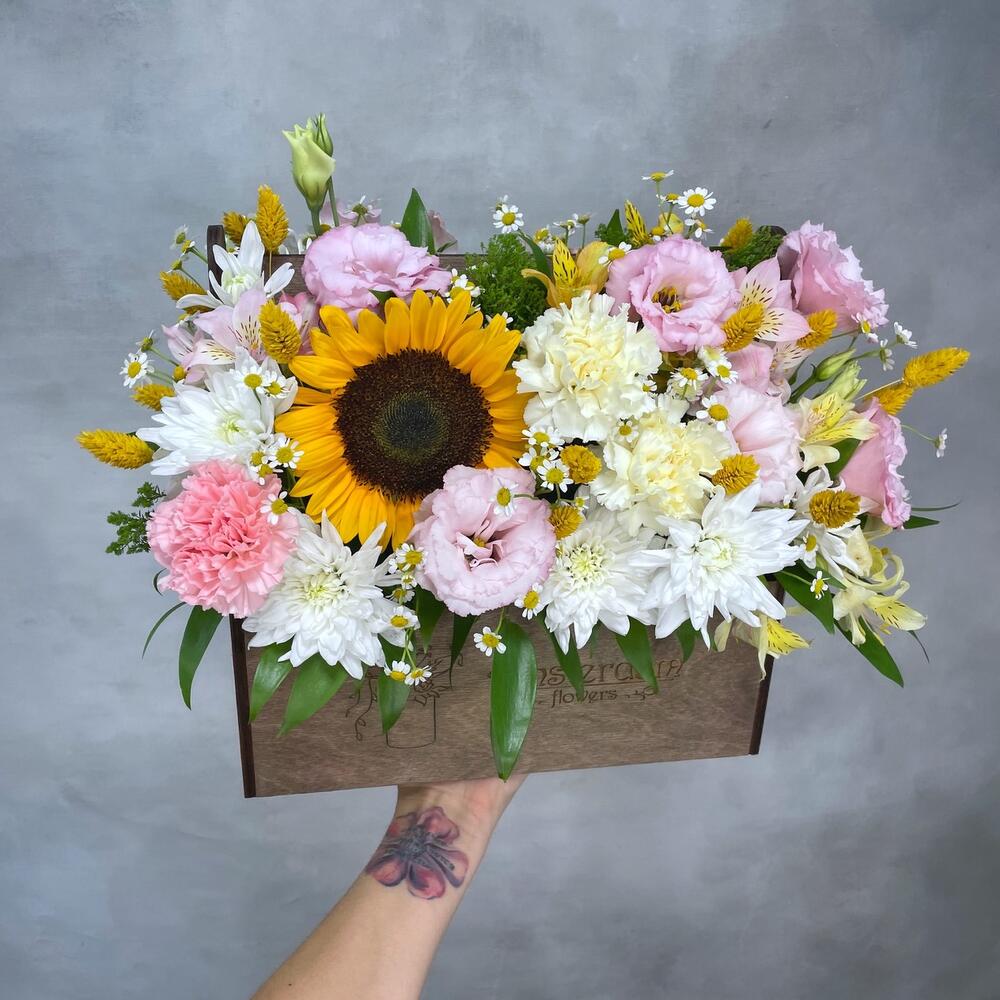 Категории: Альстромерии, Гвоздики, Лизиантусы, Подсолнухи