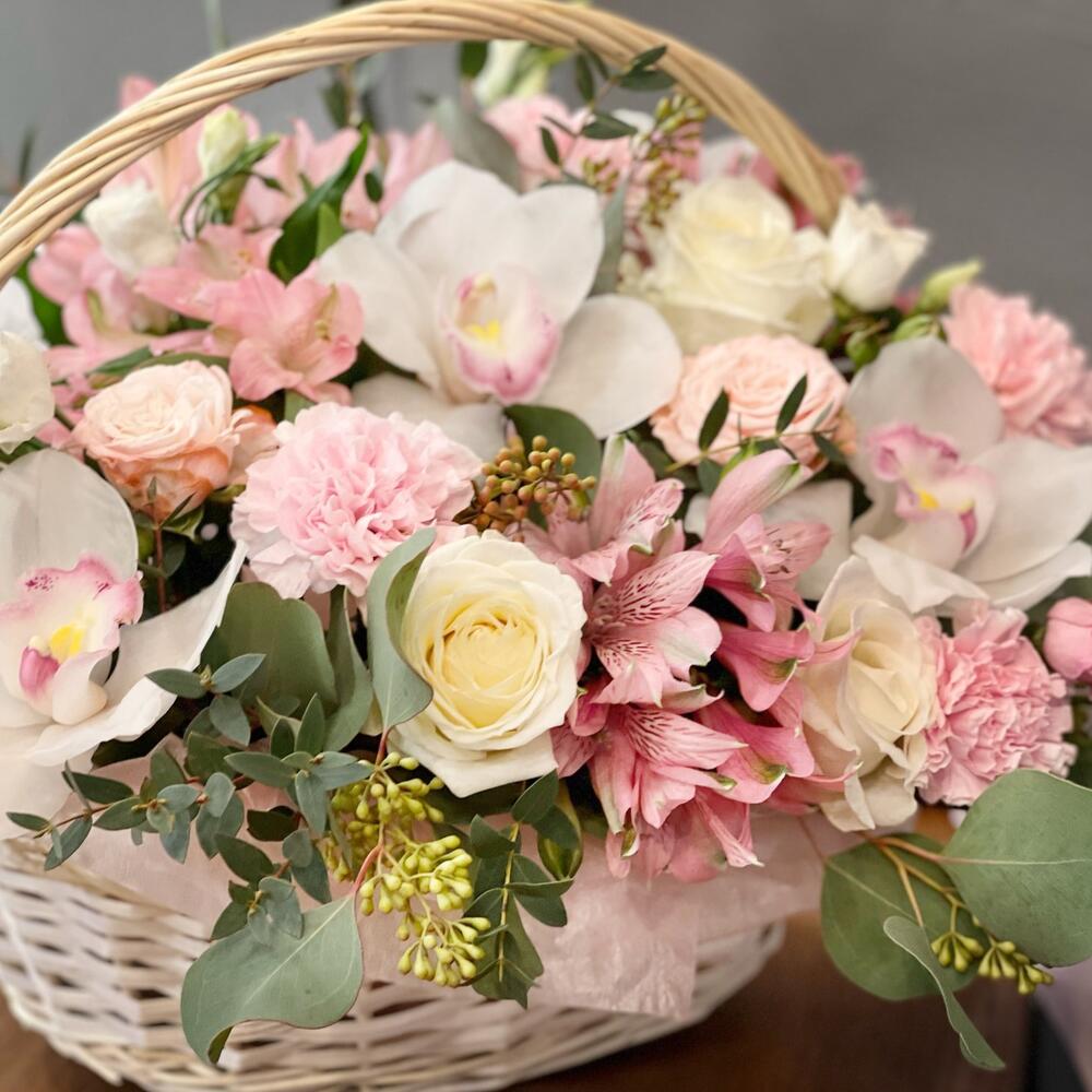 Орхидея Цимбидиум белая – 5 шт.Альстромерия – 5 шт.Эустома – 5 шт.Диантус – 7 шт.Эвкалипт Микс – 17 шт.Корзина плетеная – 1 шт.Оазис флористический – 1 шт.Лента атласная – 2 шт.Тишью – 7 шт.работа флориста – 1 шт.
