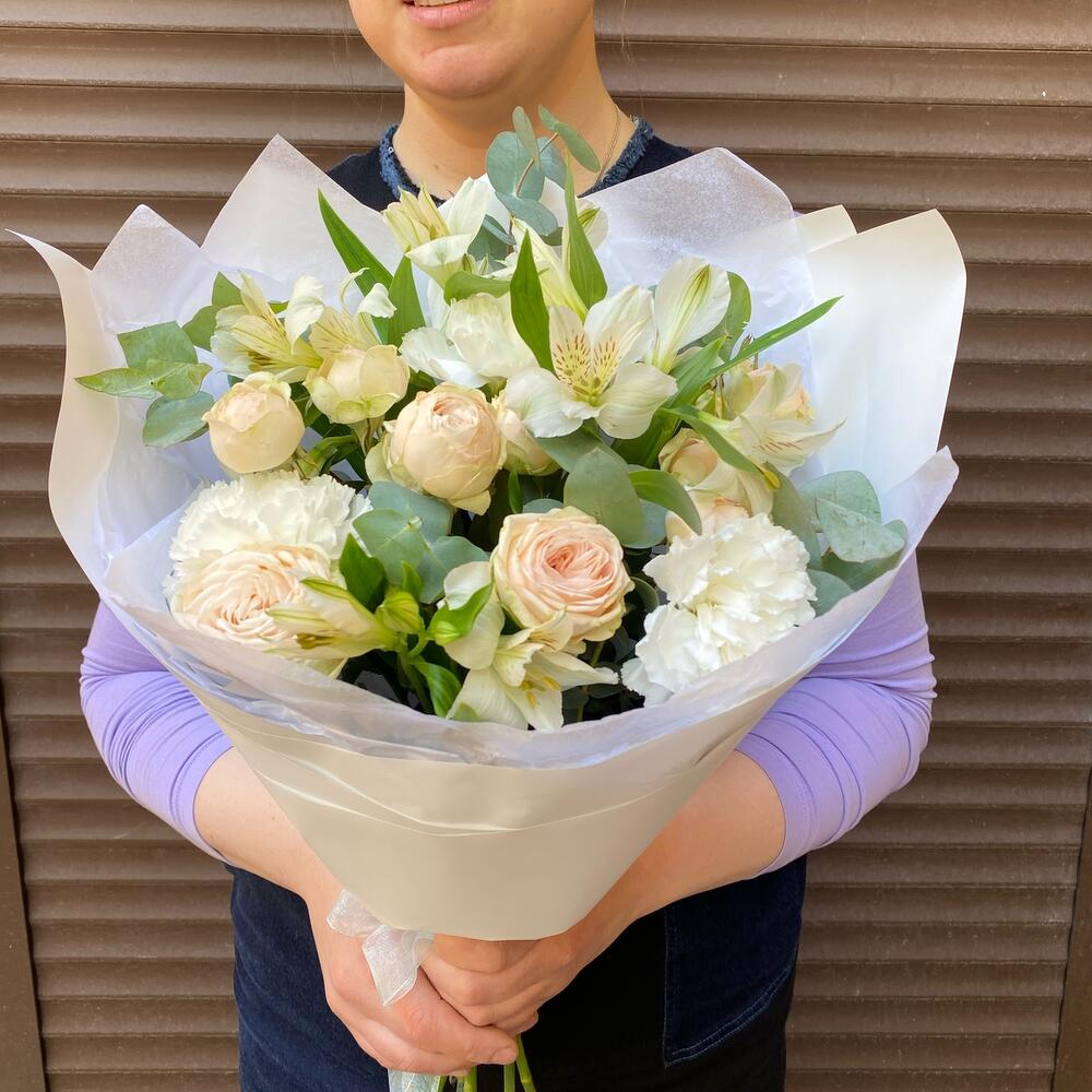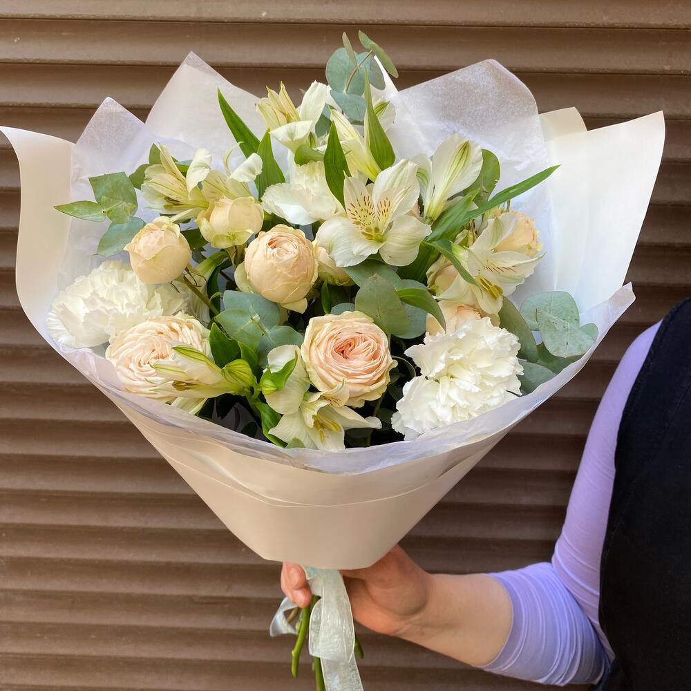 Альстромерия – 3 шт.Роза кустовая – 2 шт.Эвкалипт – 3 шт.Лента атласная – 1 шт.Диантус – 3 шт.Тишью белое – 2 шт.Пленка дизайнерская – 2 шт.лента италия – 1 шт.