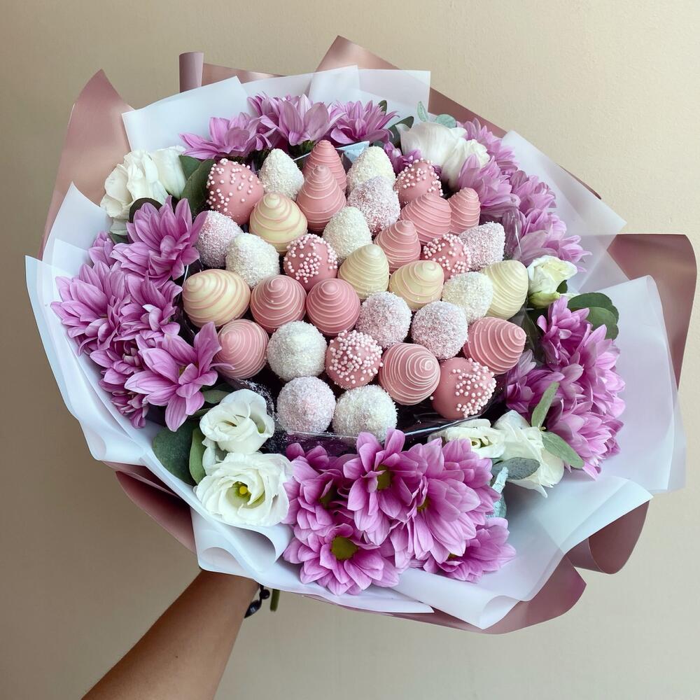 Хризантема кустовая – 5 шт.Упаковка дизайнерская – 2 шт.эустома белая – 2 шт.Клубника в шоколаде callebaut (бельгия) – 20 шт.