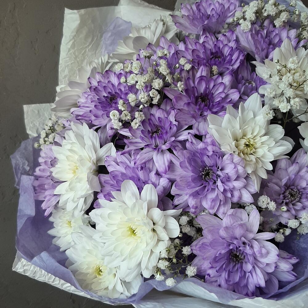 Хризантема кустовая белая – 3 шт.Хризантема кустовая крашенная – 4 шт.Гипсофила – 3 шт.Упаковка дизайнерская – 1 шт.