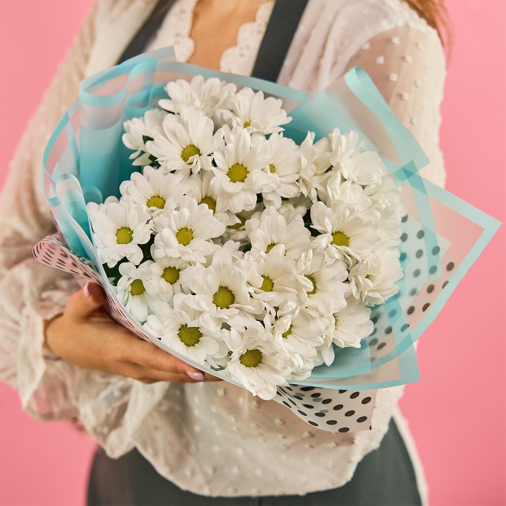 хризантема кустовая (белый) – 7 шт.пленка цветная – 1 шт.лента атласная (синий) – 1 шт.