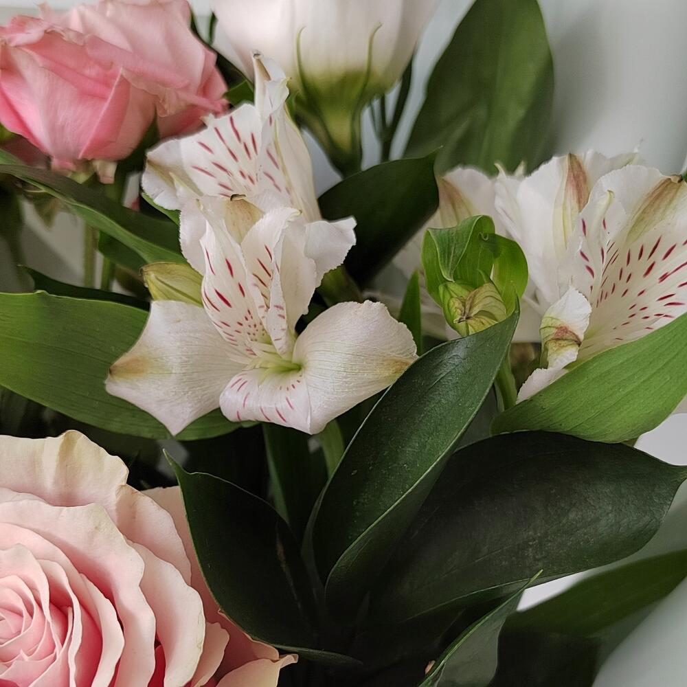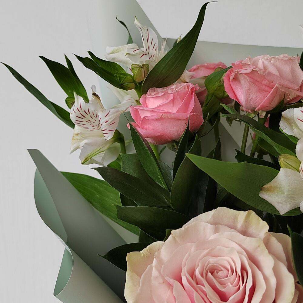 Альстромерия – 2 шт.Лента – 2 шт.Роза кустовая – 1 шт.Рускус – 3 шт.Роза – 1 шт.Упаковка – 1 шт.Эустома – 1 шт.