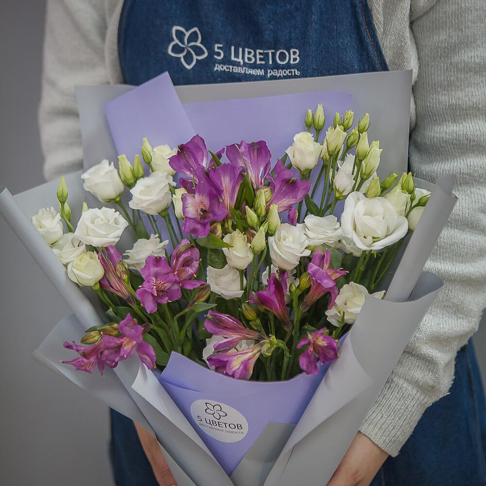 Альстромерия – 3 шт.Упаковка – 1 шт.Атласная лента – 1 шт.эустома белая – 5 шт.