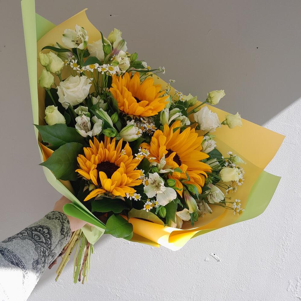 Подсолнух – 3 шт.Эустома – 2 шт.Матрикария (Ромашка Камила) – 5 шт.Альстромерия – 6 шт.Салал – 7 шт.Упаковка дизайнерская – 3 шт.Лента атласная – 2 шт.