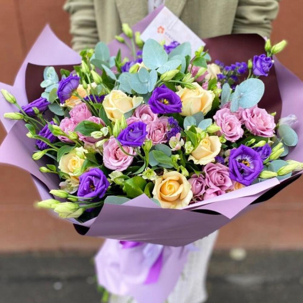 анна карина розы 50 см – 11 шт.кустовые розы – 8 шт.Альстромерия – 5 шт.Лизиантус – 5 шт.Статица – 3 шт.Рускус – 13 шт.Эвкалипт – 4 шт.