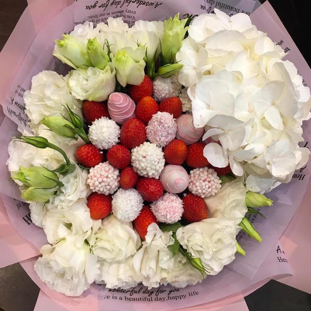 Клубника – 15 шт.Клубника в шоколаде – 12 шт.эустома белая – 5 шт.Гортензия – 1 шт.