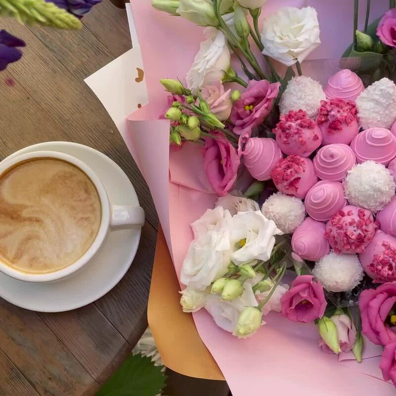 Клубника в шоколаде – 800 гр.эустома розовая и белая – 9 шт.