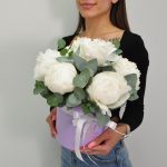 Эвкалипт – 1 шт.Лента атласная – 1 шт.Пион белый – 7 шт.Оазис флористический – 1 шт.Коробка шляпная – 1 шт.