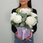 Белые ароматные пионы в коробочке с эвкалиптом