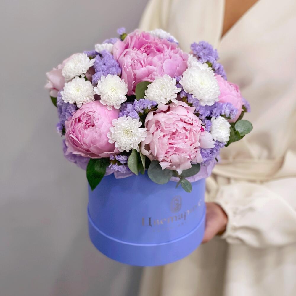 пионы розовые премиум – 7 шт.Статица лавандовая – 2 шт.Сантини – 3 шт.Эвкалипт – 2 шт.Шляпная коробка – 1 шт.