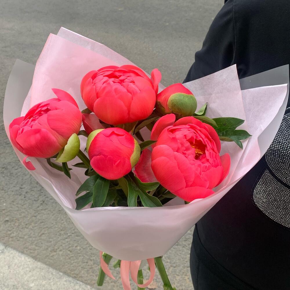 Лента – 2 шт.Пион – 5 шт.Упаковка дизайнерская – 2 шт.