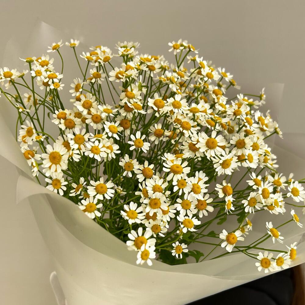 Лента атласная – 2 шт.Упаковка дизайнерская – 3 шт.ромашка кустовая танацетум – 9 шт.