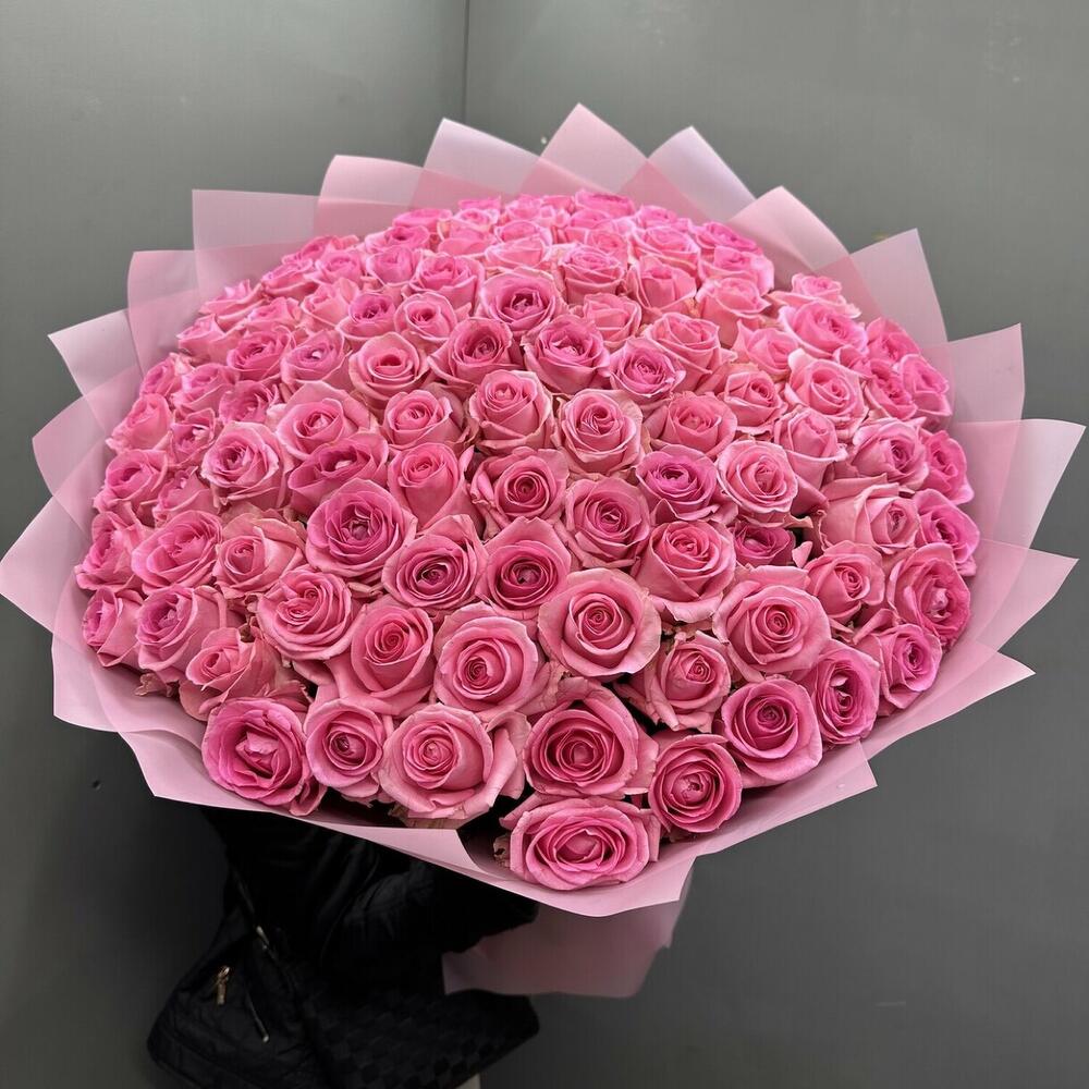 Лента атласная – 1 шт.Дизайнерская упаковка – 5 шт.розы эквадор (60 см) – 101 шт.