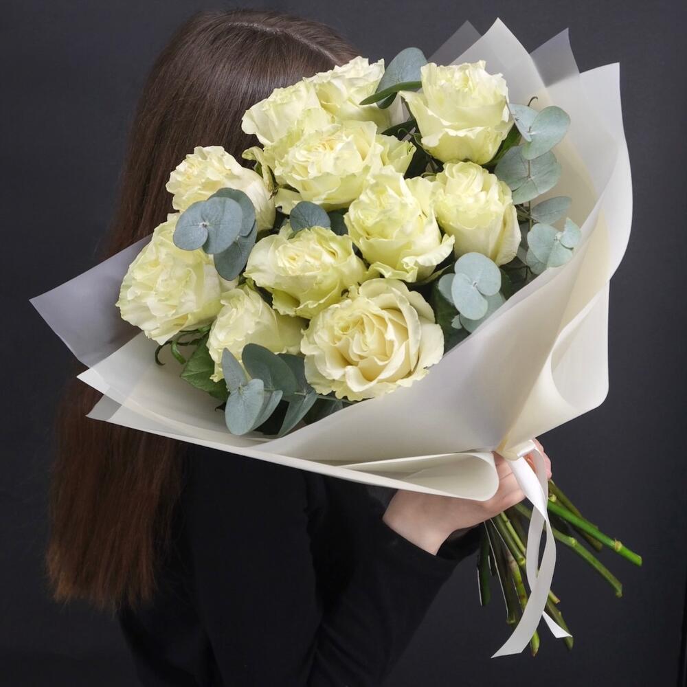 11 белых пионовидных роз с эвкалиптом