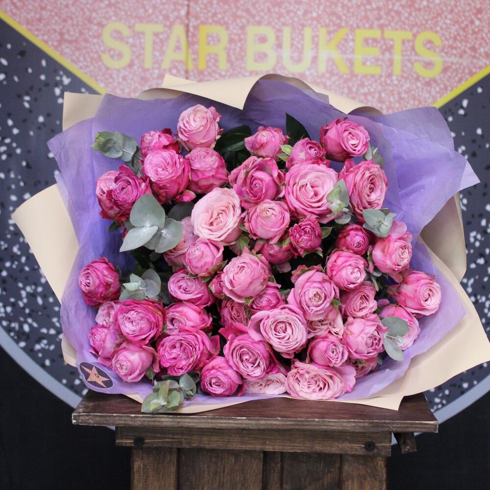 11 пионовидных кустовых роз + эвкалипт