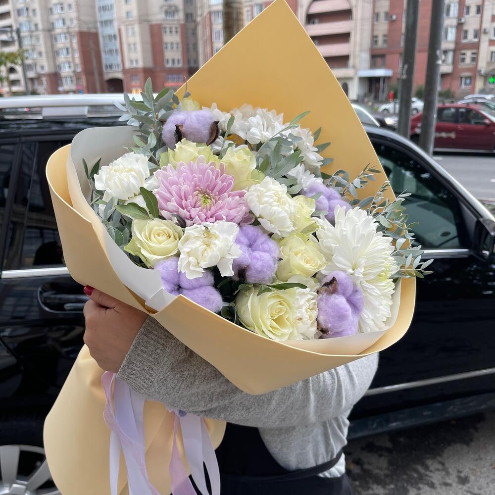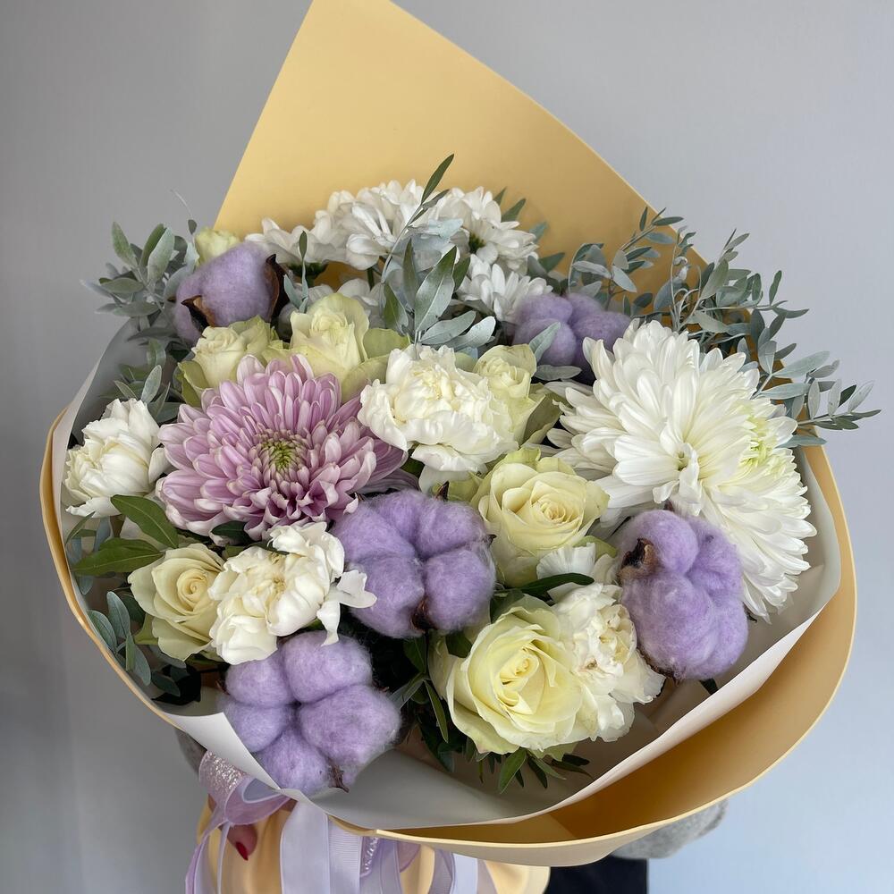 Хризантема кустовая – 1 шт.Кустовая роза – 2 шт.Роза Эквадор – 1 шт.Гвоздика – 2 шт.Лента атласная – 3 шт.Пленка матовая – 6 шт.Колосок – 1 шт.Хлопок натуральный – 5 шт.фисташка зелень – 5 шт.момоко хризантема – 1 шт.