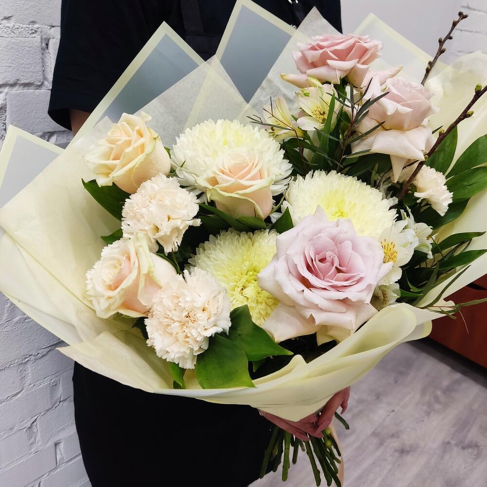Альстромерия – 2 шт.Эвкалипт – 1 шт.Роза – 6 шт.Гвоздика – 4 шт.хризантемы одноголовые – 3 шт.Рускус – 15 шт.Упаковка дизайнерская – 1 шт.Лента атласная – 3 шт.