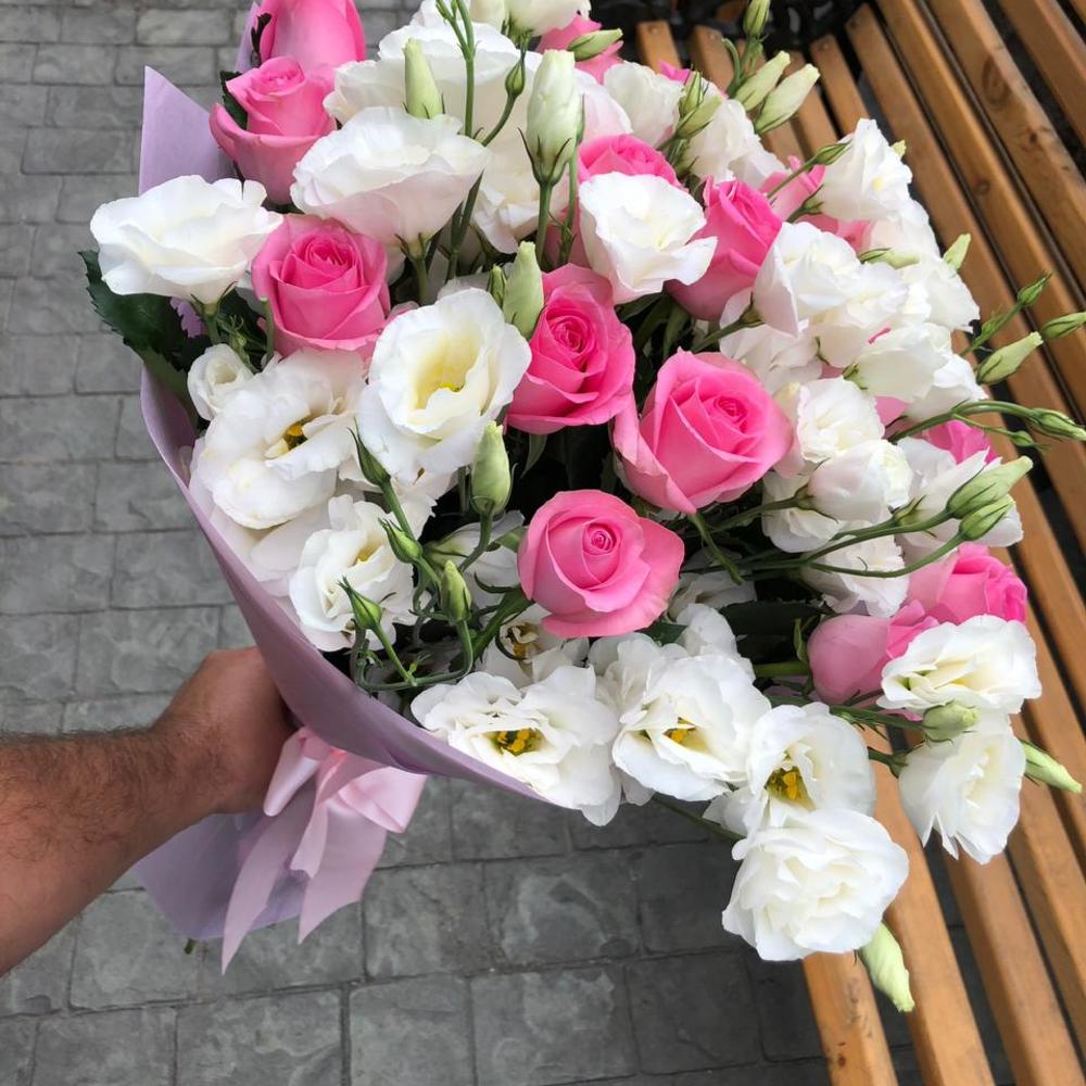 Белые эустомы с розовыми розами