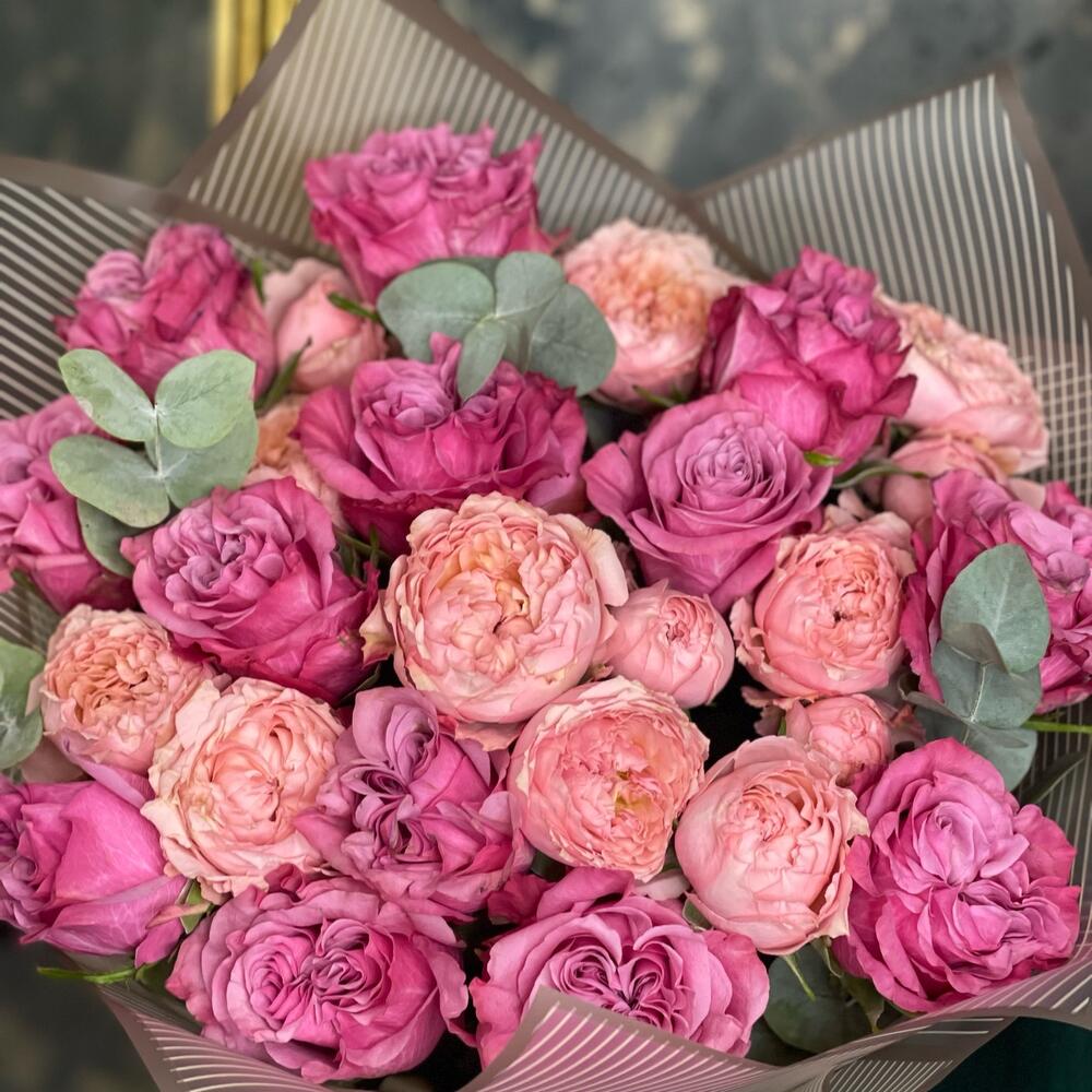 роза пионовидная кантри блю – 13 шт.роза пионовидная кустовая джульетта – 5 шт.Эвкалипт – 3 шт.Пленка матовая – 3 шт.Лента атласная – 2 шт.