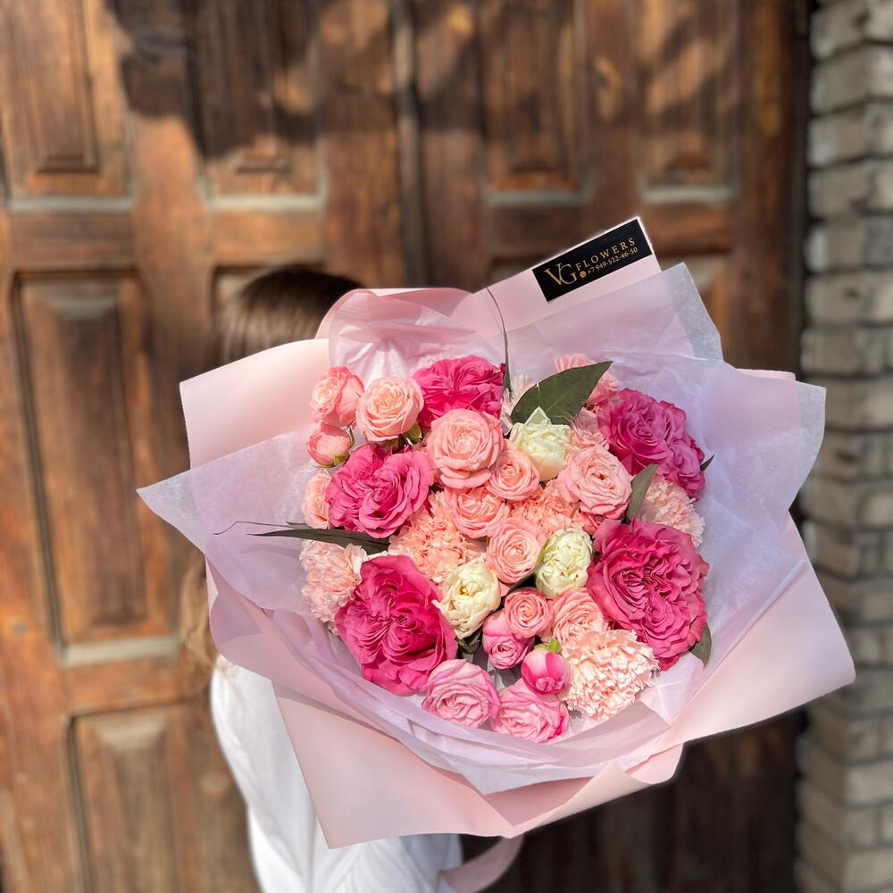 Гвоздики, Пионовидные розы, Розы