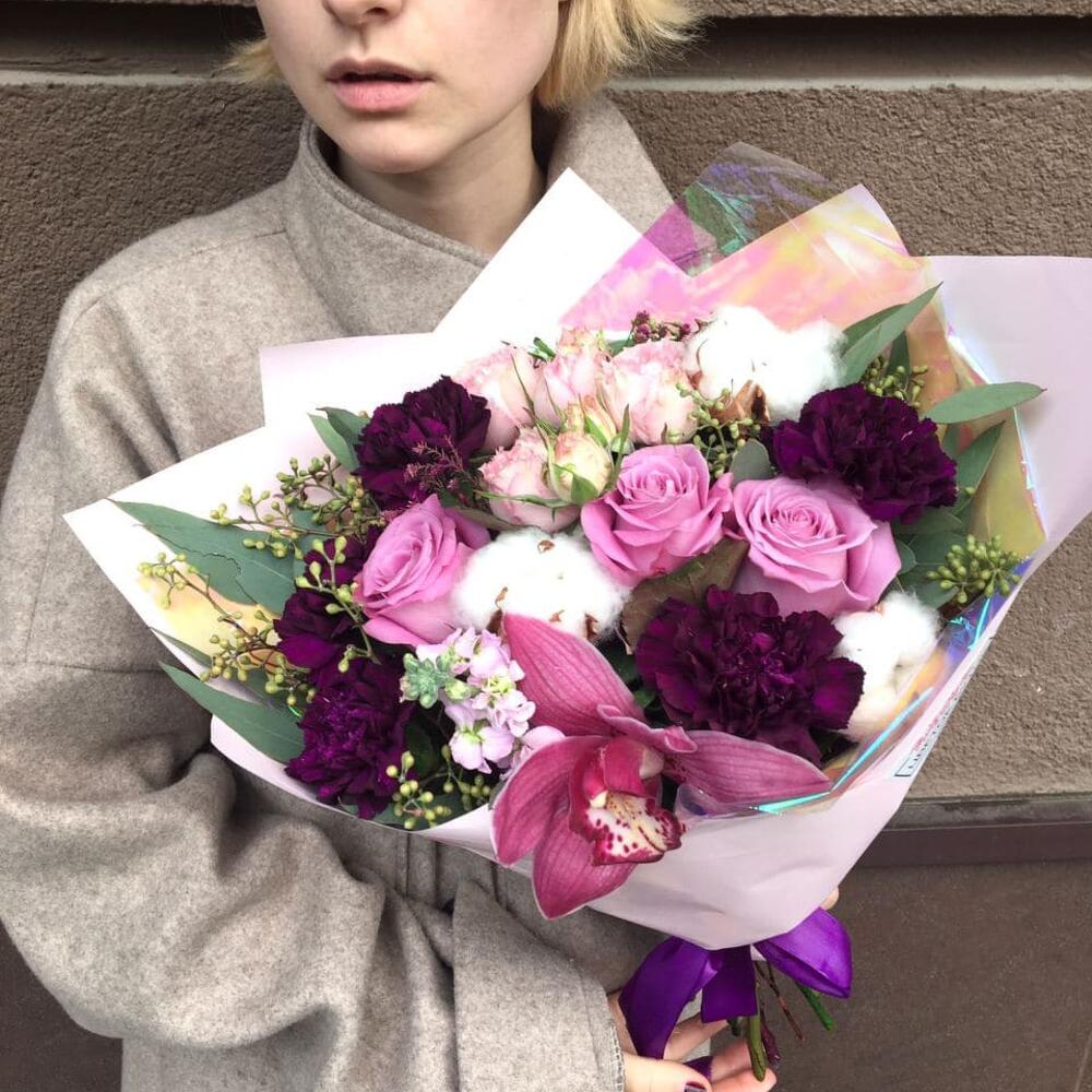 Хлопок – 3 шт.Эвкалипт – 2 шт.Роза – 3 шт.Кустовая роза – 1 шт.Гвоздика – 5 шт.орхидея – 1 шт.