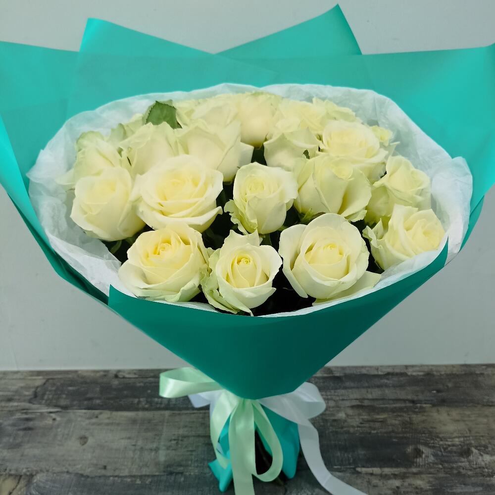 Тишью – 3 шт.Упаковка дизайнерская – 4 шт.роза россия белая 60 см – 25 шт.