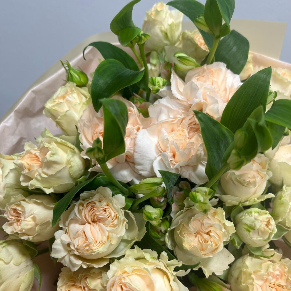 Кустовая пионовидная роза – 5 шт. Гвоздика персиковая – 3 шт. Авторская упаковка – 1 шт. шармелия – 2 шт.
