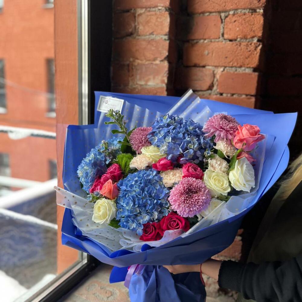 Букет из гортензии, хризантемы, гвоздики, оксипеталума и роз в стильной упаковке “Ласковый ветерок”