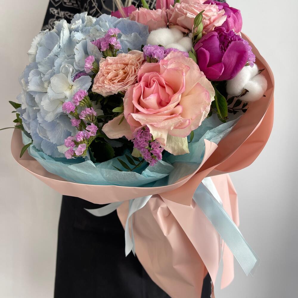 Гортензия – 1 шт.Пион – 3 шт.Статица – 1 шт.Тюльпан – 3 шт.Пленка – 4 шт.Хлопок натуральный – 2 шт.джульетта роза пионовидная – 1 шт.стифа пучок – 1 шт.