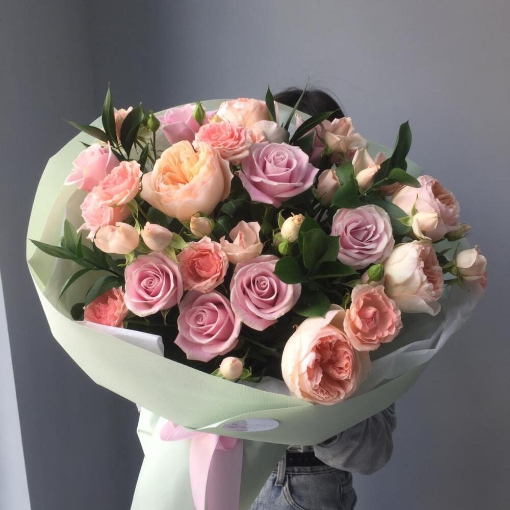 Альстромерии, Кустовые розы, Лизиантусы, Пионовидные розы, Розы, Ромашки