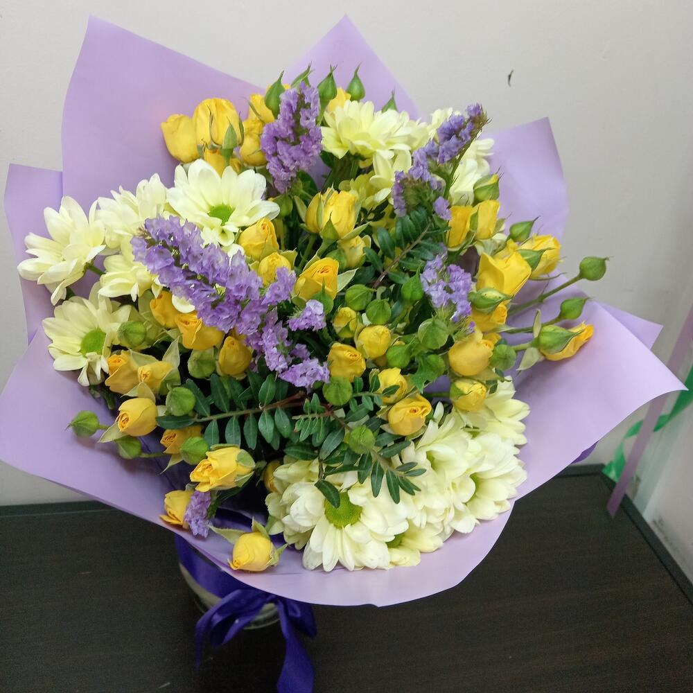 Хризантема кустовая – 3 шт.Роза кустовая – 9 шт.Лимониум – 2 шт.Зелень – 3 шт.Упаковка – 1 шт.