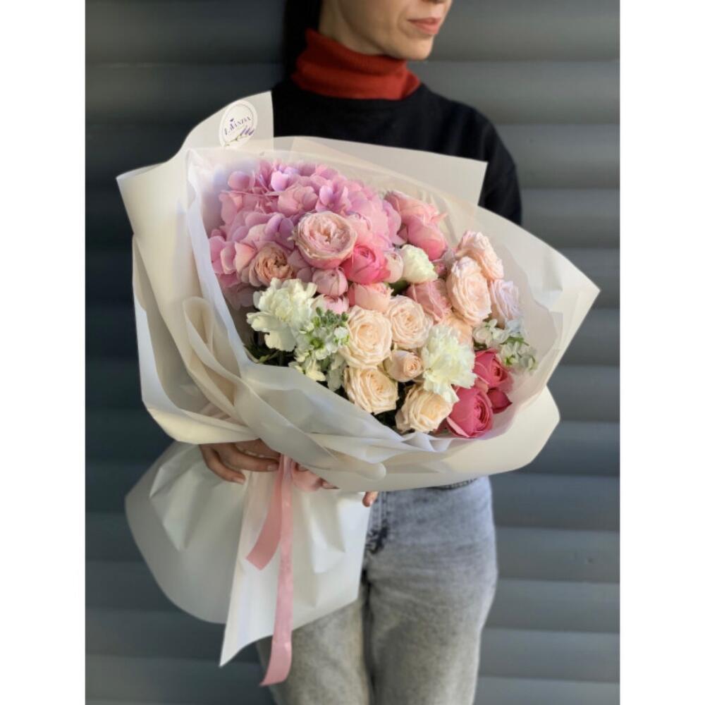 Альстромерии, Гвоздики, Кустовые розы, Лизиантусы, Розы, Хризантемы