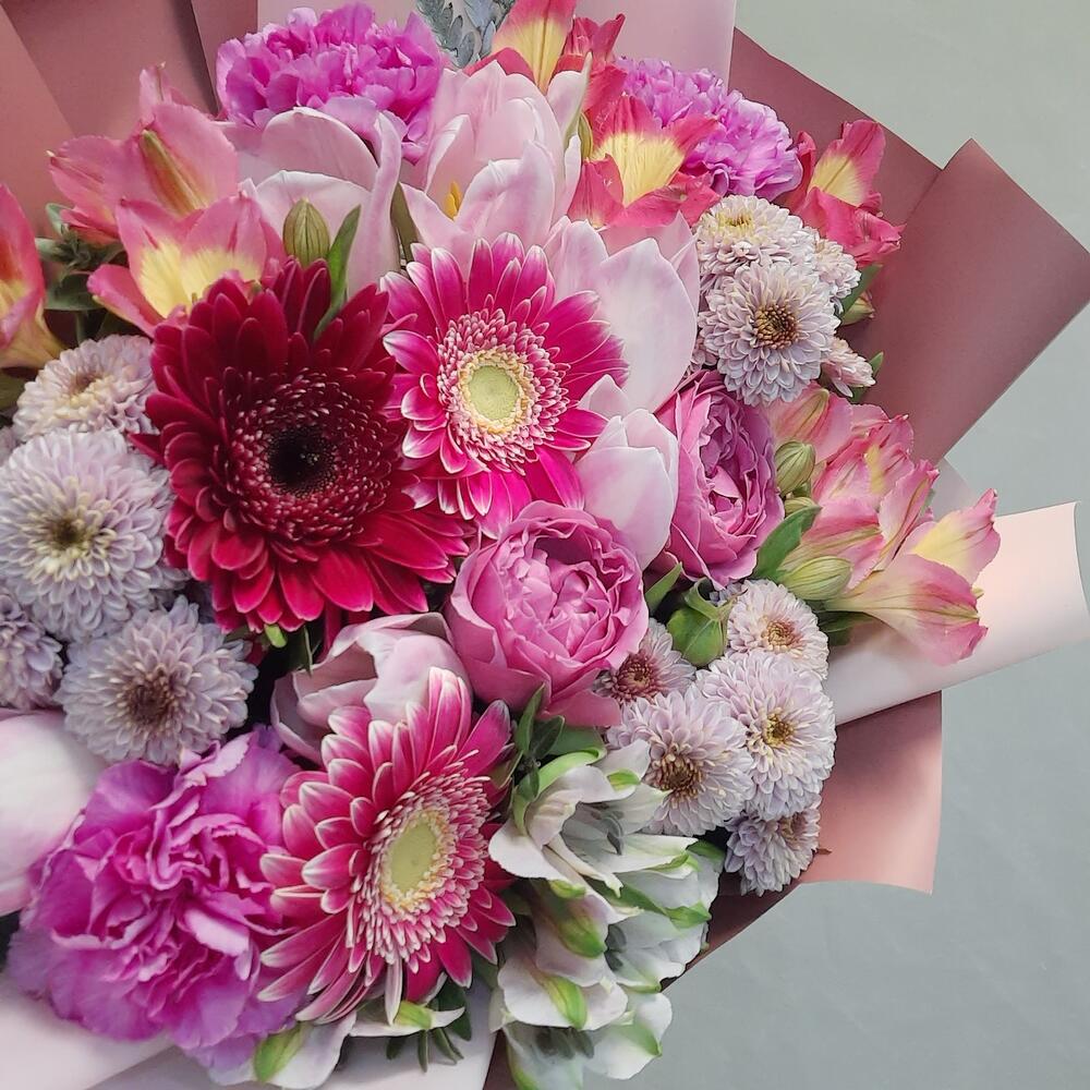 Категорий: Альстромерии, Гвоздики, Кустовые розы, Пионовидные розы, Розы, Тюльпаны