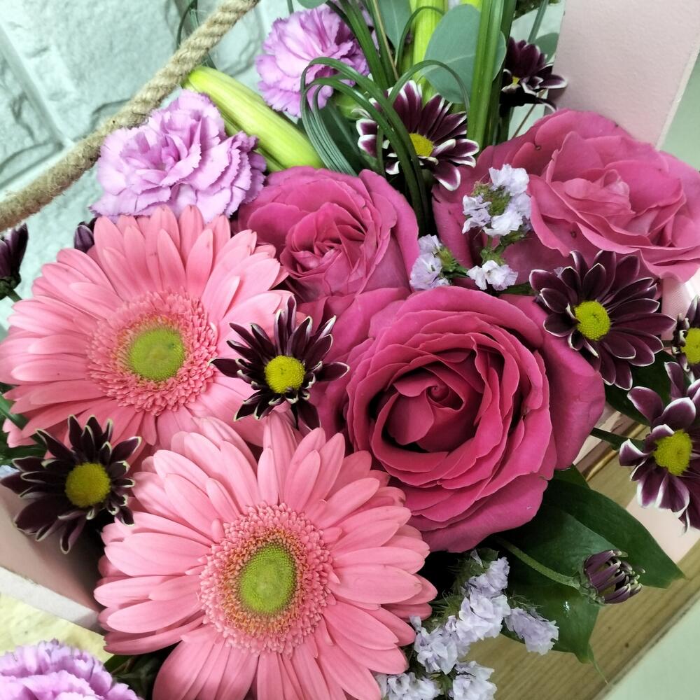 Хризантема кустовая – 2 шт.Роза Эквадор – 3 шт.Лента атласная – 1 шт.Гербера – 2 шт.Лилия белая – 1 шт.Гвоздика сортовая – 3 шт.Ящик деревянный – 1 шт.Эвкалипт Микс – 2 шт.Оазис флористический – 1 шт.Статица сиреневая – 1 шт.