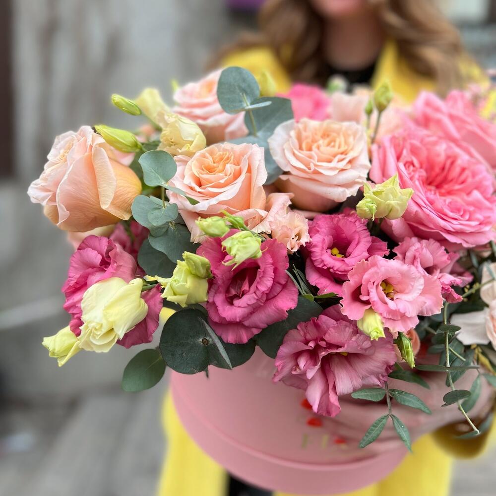 Цветочная коробка с пионовидными розами, лизиантусами, сортовыми диантусами, ароматными веточками джинстер, душистый эвкалипт и разными цветочными изысками!